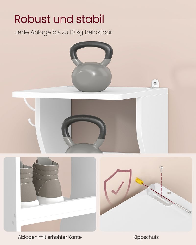 Die erhöhten Kanten sorgen für zusätzliche Stabilität und schützen die Wand vor Kratzern. Die mitgelieferte Kippsicherung verhindert ein Umkippen.