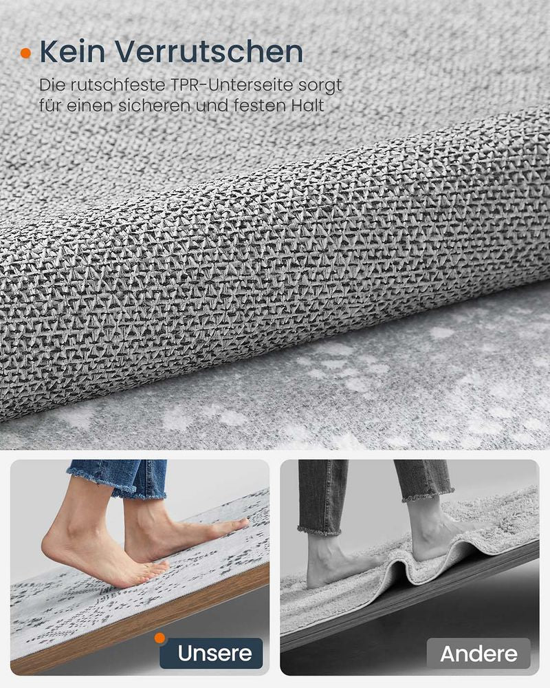 Die Rückseite des Teppichs besteht aus TPR (thermoplastischem Gummi) und bietet festen Halt auf harten Böden wie Holz oder Fliesen – ideal für Wohnzimmer, Schlafzimmer oder Kinderzimmer.