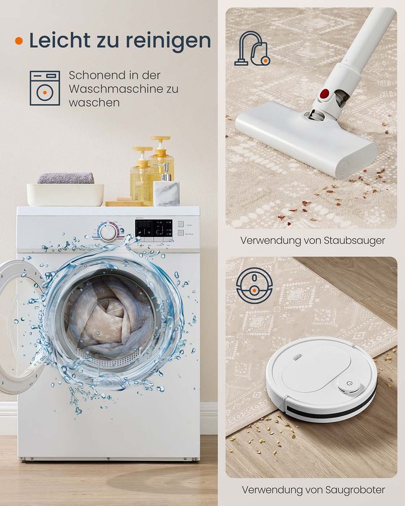 Dieser Teppich ist auf Langlebigkeit ausgelegt: Er fusselt nicht, bleibt weich und ist maschinenwaschbar. Auch nach mehreren Wäschen behält der Stoff seine Form und Farbe – praktisch für den täglichen Gebrauch.