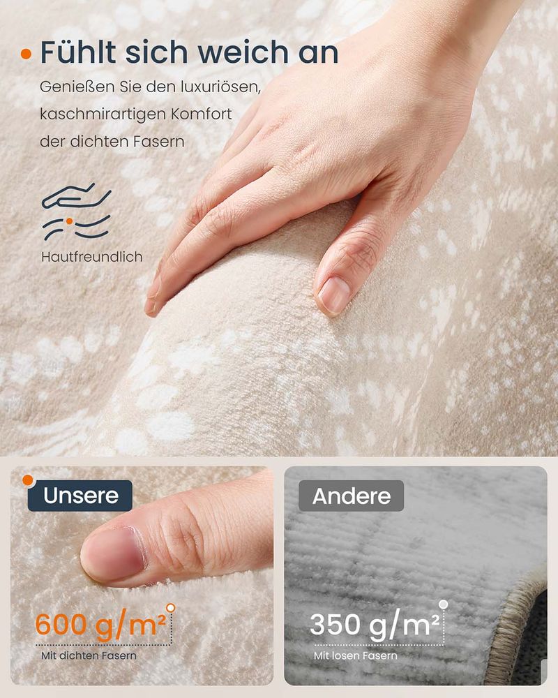 Mit einer weichen 600 g/m² Polyesterfaser-Oberschicht und einer 200 g/m² Filz-Mittelschicht fühlt sich dieser Teppich wunderbar bequem an – perfekt zum Barfußlaufen am Morgen oder zum Entspannen mit einem guten Buch.