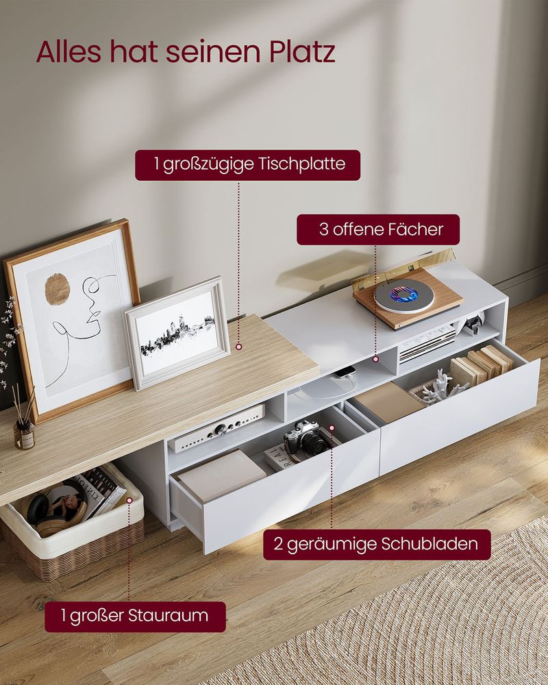 Ausziehbarer TV-Ständer – Mit LED-Beleuchtung & Ladestation – Für Fernseher bis 65 Zoll – Verstellbare Länge 162-270 cm – Weiß/Beige