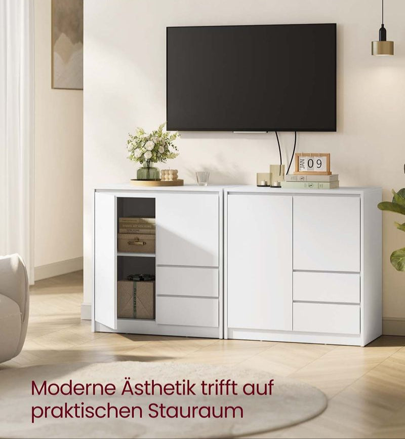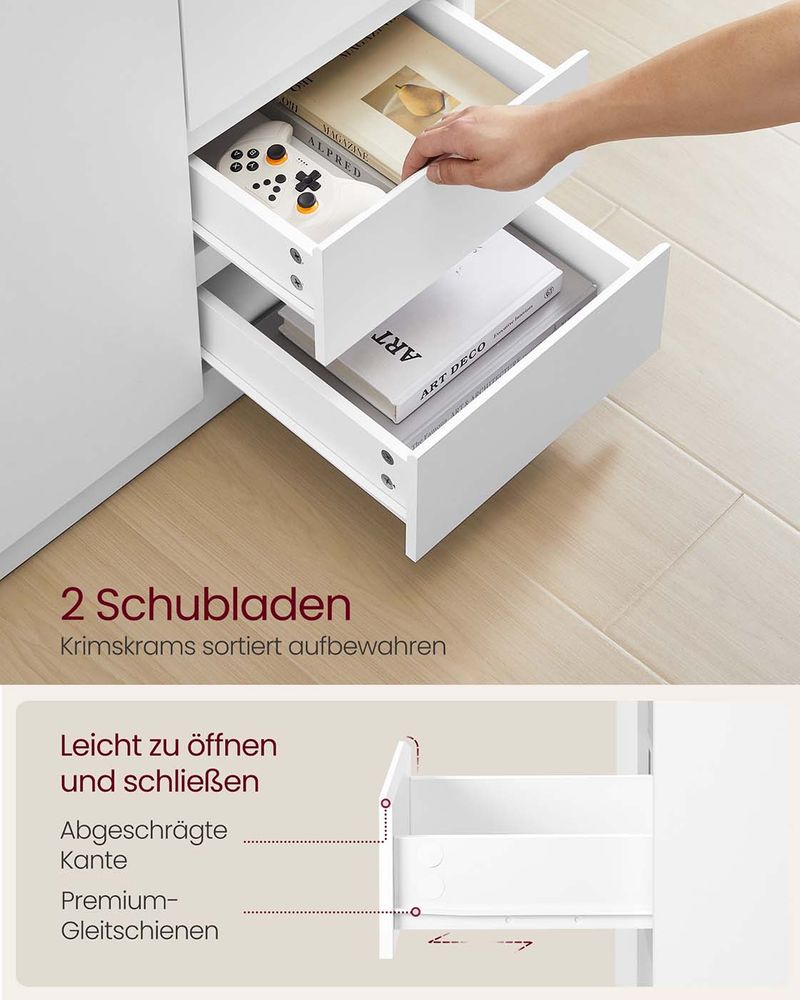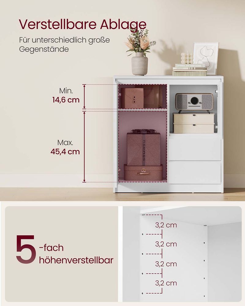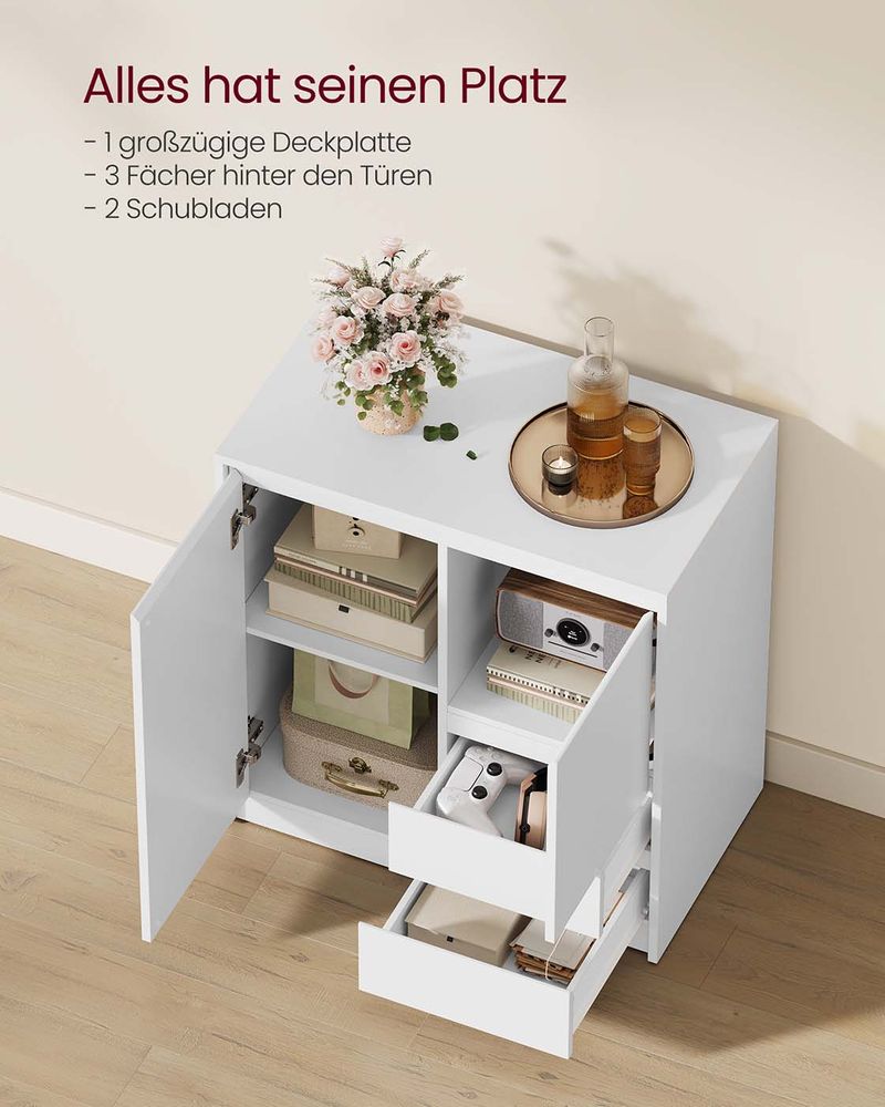 Mit 3 Fächern hinter den Türen, 2 Schubladen und einer geräumigen Oberseite haben Sie viel Platz, um Geschirr, Kochgeschirr und andere Utensilien ordentlich aufzubewahren.
