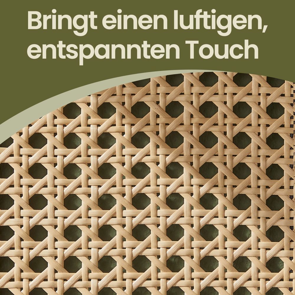 Dieses schwebende Wandregal kombiniert eine warme, erdige Farbe mit dekorativen PVC-Seitenteilen in Rattan-Optik. Sein eleganter Look verleiht Ihrem Wohnzimmer, Schlafzimmer oder Home-Office einen Hauch von natürlichem Charme.