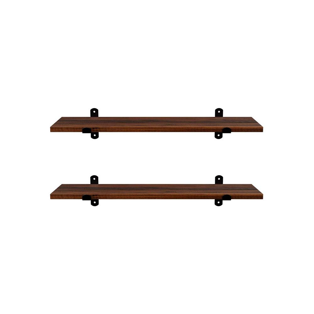 Verleihen Sie leeren Wänden mit diesem Set aus zwei Wandregalen aus romantischem dunkelbraunem Holz und einer tiefschwarzen Metallhalterung ein stimmungsvolles Upgrade. Ideal für alle, die Charakter und einen warmen Stil lieben.