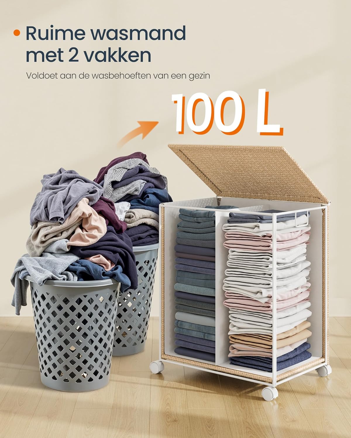 Wäschekorb mit 2 Fächern – 100 L – mit Rollen, Deckel und herausnehmbarem Wäschesack – Rattanoptik – Naturbeige